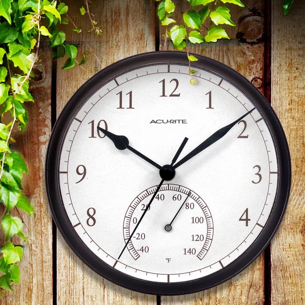 The AcuRite 9.25 in. Black Indoor or Outdoor Wall Clock with Thermometer features a black frame and slightly antiqued face complemented by rich brown numerals. Lend the welcoming, informal look of cottage styling to any indoor or outdoor space. Highly accurate quartz movement timekeeping technology. Includes an integrated hang hole for easy wall mounting. 1-year limited warranty. It’s more than accurate, it’s AcuRite.
