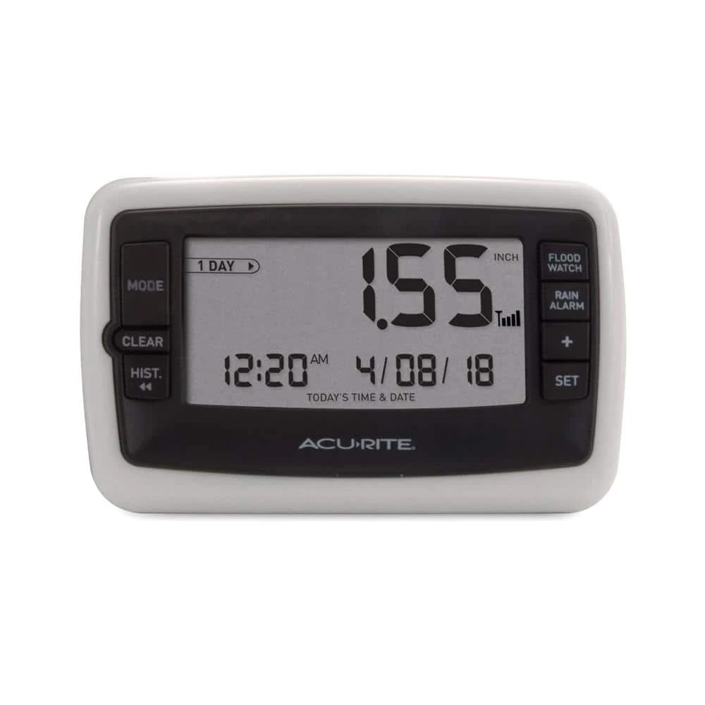 Weather the day with confidence with your own accurate and up-to-date information right from your own backyard. The AcuRite Digital Rain Gauge with Self-Emptying Wireless Rain Collector features precise, reliable rainfall measurements. The bold, easy to read LCD screen displays daily rainfall and records rainfall history, including a rainfall event, 1 day or 7 days of measurements. Includes rain and flood watch alarms, alerting you when rainfall begins and when conditions are right for possible flooding. The outdoor sensor features a self-emptying mechanism and transmits rain data wirelessly. Includes a clock and calendar. Display stands upright for tabletop use or is wall-mountable. One-year limited warranty. It’s more than accurate, it’s AcuRite.
