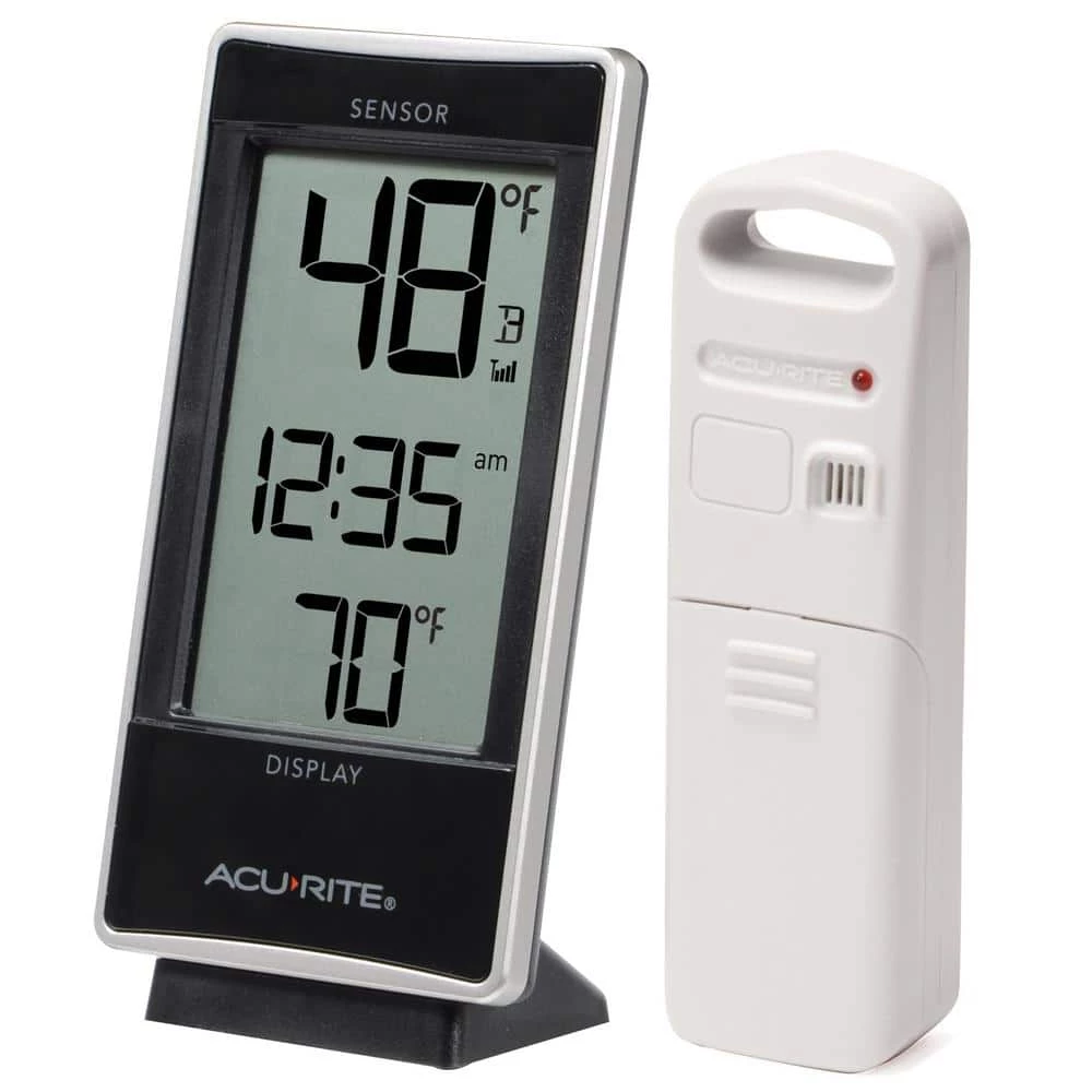 The AcuRite Digital Indoor Outdoor Thermometer delivers precise, reliable multi-zone temperature information. An easy-to-read LCD screen shows the current temperature for multiple locations. One temperature reading is taken by a built-in sensor inside the digital weather thermometer display. An additional reading is taken by a wireless thermometer sensor you can place either outdoors or in another room. Features include daily high and low records and a 12-hour clock. The sleek, stylish display stands upright for tabletop use and is wall-mountable. For a multi-zone wireless weather thermometer solution, you can connect up to two additional wireless sensors (sold separately), to monitor a total of four locations (including the display’s built-in thermometer). When used with multiple wireless sensors, if desired, the display can be set to auto-cycle through each sensor’s readings. The digital weather thermometer sensor features powerful wireless technology, a weather-resistant design and an integrated hanger for easy mounting. Limited one-year warranty.