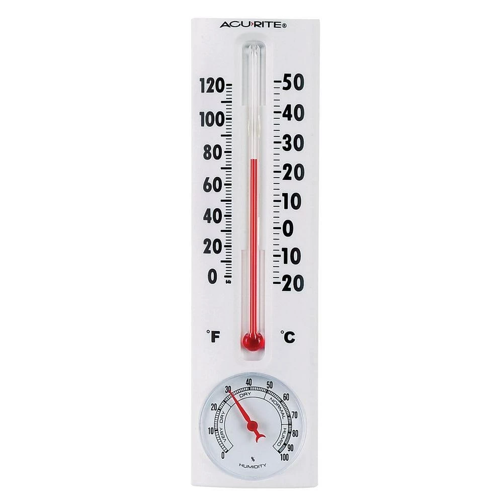 The AcuRite 8.5 in. Thermometer with humidity allows you to check comfort conditions at a glance with this temperature and humidity gauge combination. Durable, weather resistant construction is suitable for indoor or outdoor use. Includes an integrated hang hole for easy mounting. One-year limited warranty. It’s more than accurate, it’s AcuRite.