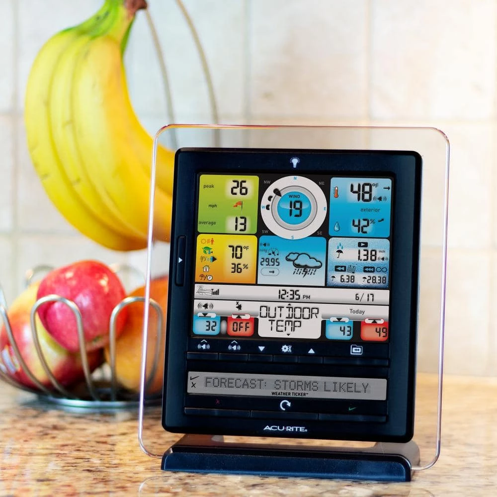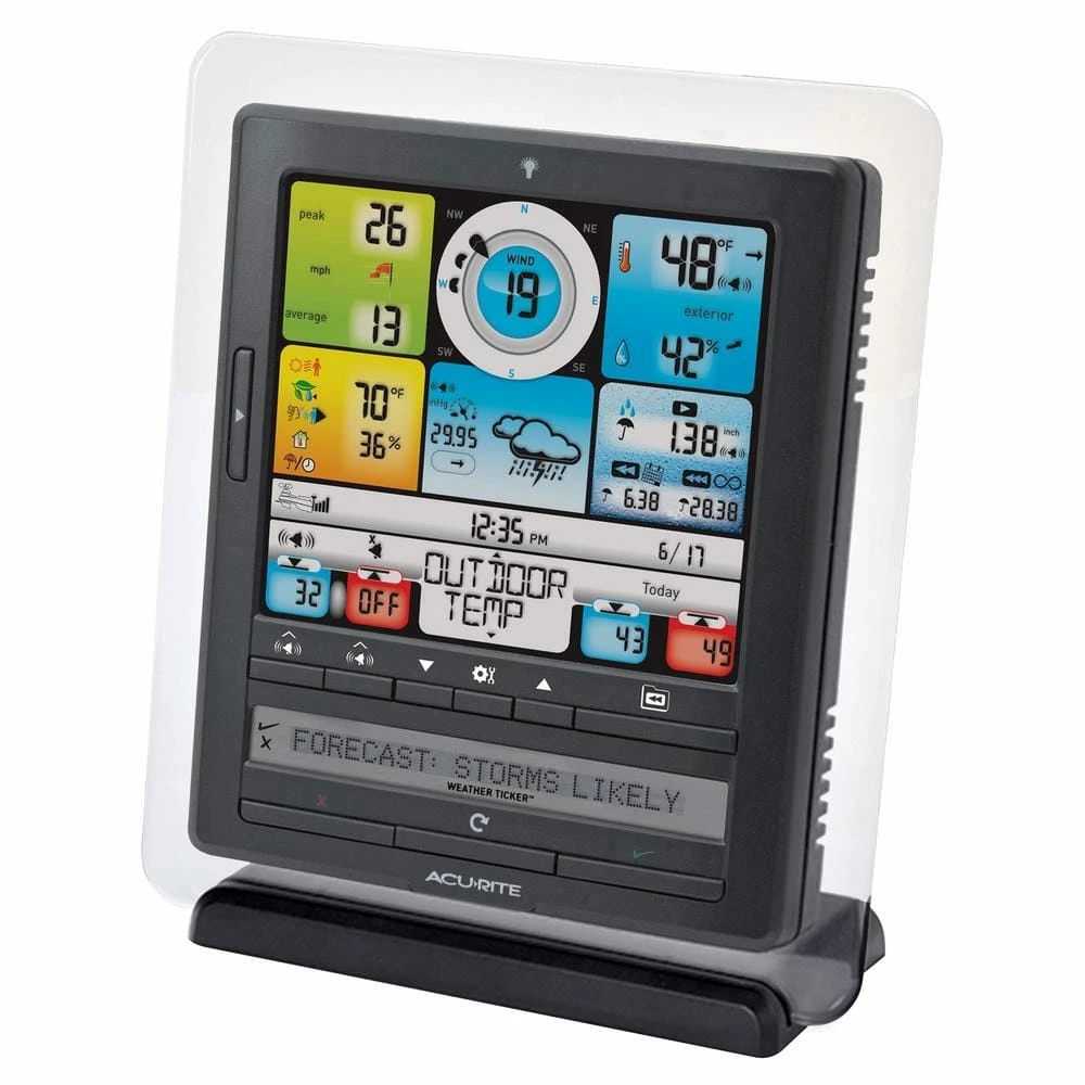 The AcuRite Iris (5-in-1) Wireless Weather Station measures indoor and outdoor temperature and humidity, rainfall and rainfall history, wind speed and direction, and barometric pressure – all on an easy-to-read, illuminated color display. Plus, as part of patented AcuRite technology, you’ll receive a self-calibrated, hyperlocal forecast for 12 hours from current conditions that is generated from weather data measured by a sensor in your backyard. The PC Connect feature delivers your weather data to your PC and allows you to stream your data online so you can monitor conditions remotely from a web browser or mobile device using the My AcuRite website or app. You can also set programmable weather alerts for the following conditions: temperature, humidity, wind, rain, dew point, heat index, and storm alerts – so you’ll always be aware of incoming an incoming tempest.