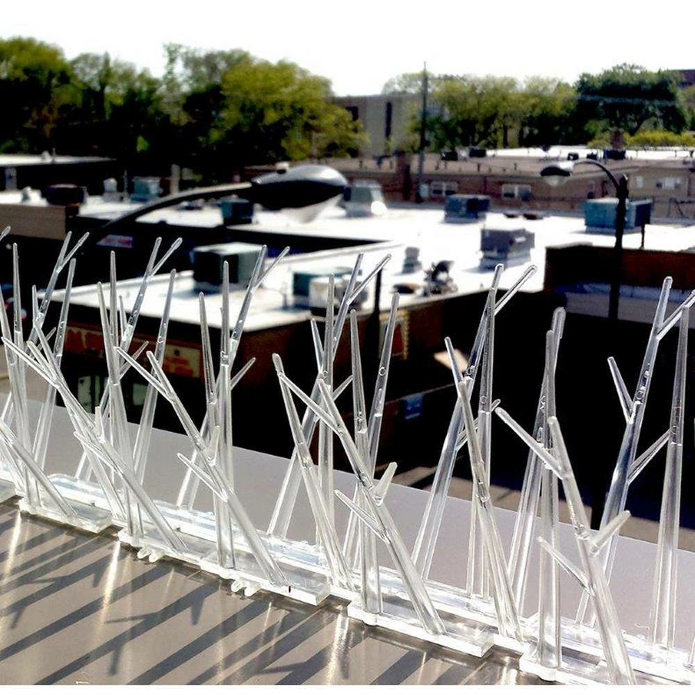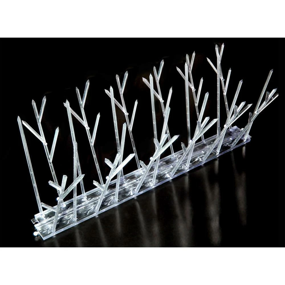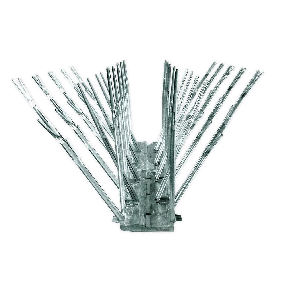 Block pest birds from their favorite landing and roosting surfaces with Bird-X Bird Spikes. Tough, long-lasting polycarbonate material provides maintenance-free protection. Transparent material doesn’t mar the look of a building. The spikes function as a keep-out sign for birds. The density of spikes is branched from the vertical shafts to offer impenetrable coverage. Spikes allow mounting on most surfaces and are easy to install with adhesive (not included). Each foot of spikes covers 1 lin. ft., and a spread or width of up to 6 in. It’s the most effective, inexpensive, and permanent solutions to keeping those annoying birds off any commercial or residential surface. Fifty 1 ft. sections per box.