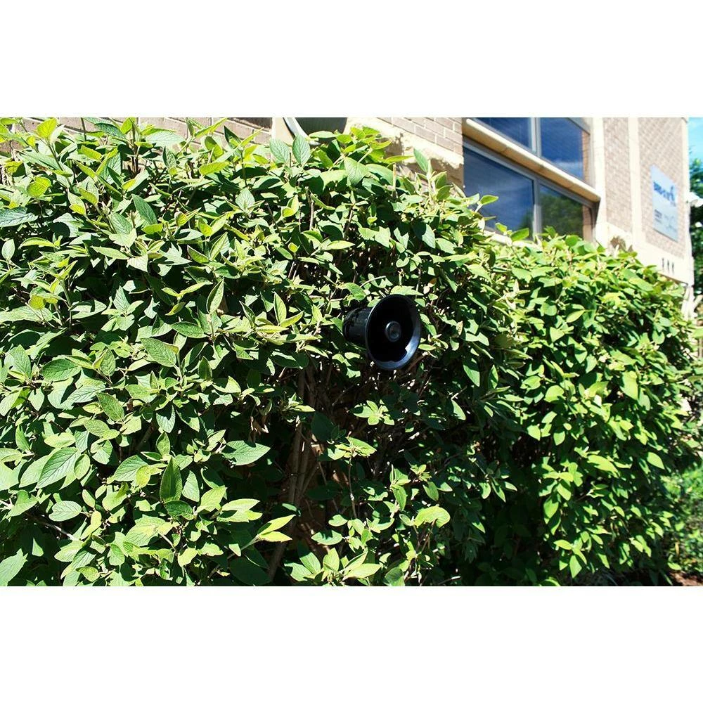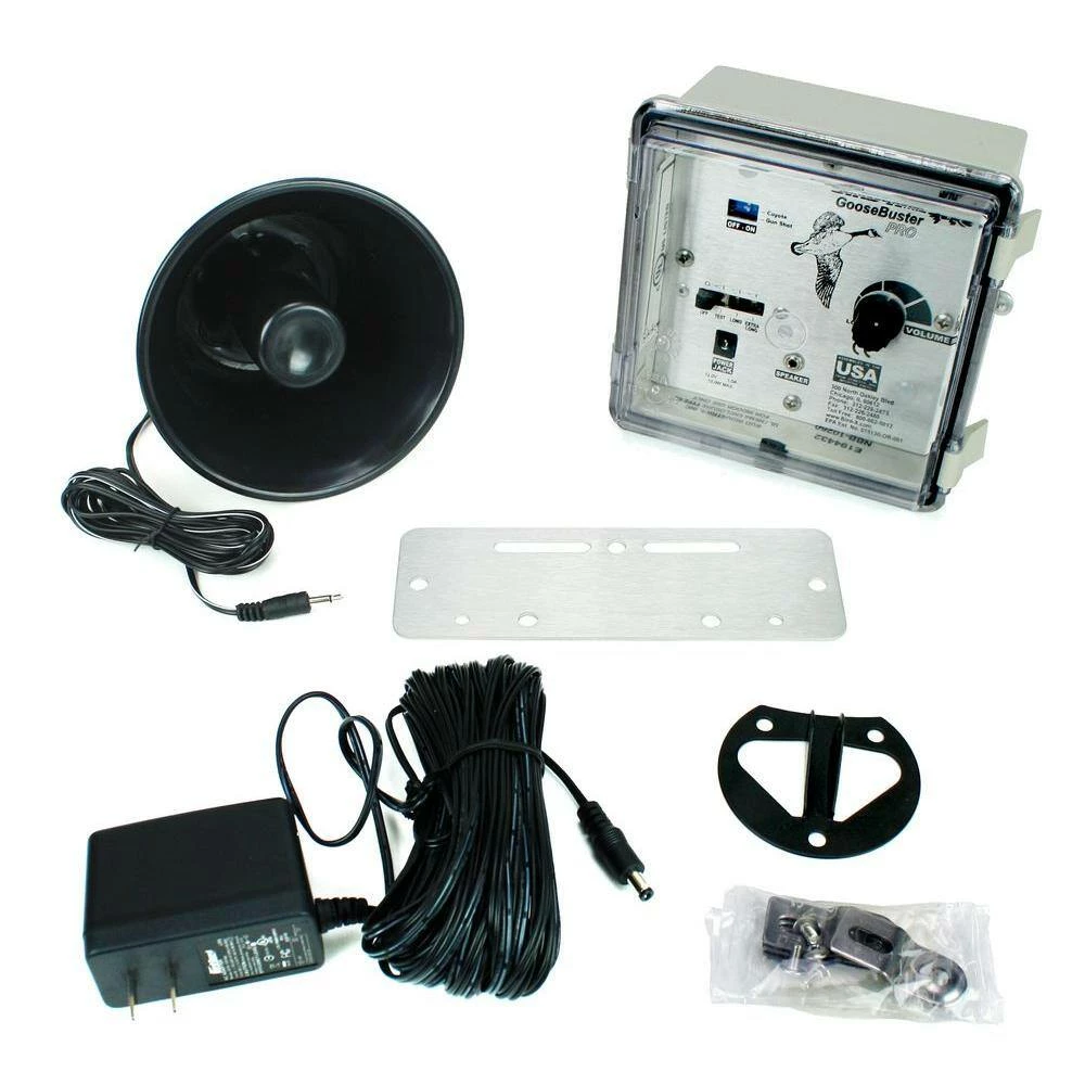 Electronic Goose Repeller targets pesky Canada Geese and disturbs them with natural sounds. Geese understand the natural vocal communications as signals to leave the area. The system features adjustable controls including volume and timing. Natural Goose alarm and alert calls repel geese from up to 2 acres. Ideal for use around bodies of water and open grassy areas. Perfect for lakes, ponds, golf courses, parks, corporate campuses or anywhere geese are a problem. Durable construction make this system weatherproof and commercial quality. For residential or commercial use. AC operated. Developed from years of research on Canada Goose species.
