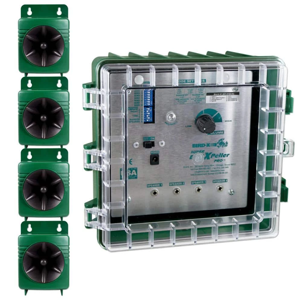 The Bird-X Super BirdXPeller Pro is an effective, eco-friendly and human way to rid your property of pesky birds quickly. This supersonic audio repellent is safe-to-humans and operates by emitting naturally recorded bird distress sounds and predator sounds that confuse and disorient birds up to 6 acres. The BirdXPeller Pro is customizable for your specific needs and comes available for a variety of needs; version 1 repels pigeons, starlings, sparrows, and gulls. Safe for outdoor use, this device features a NEMA-approved weatherproof casing and 4 speakers each complete with 100 ft. of cable for strategic placement. Covers up to 6 acres.