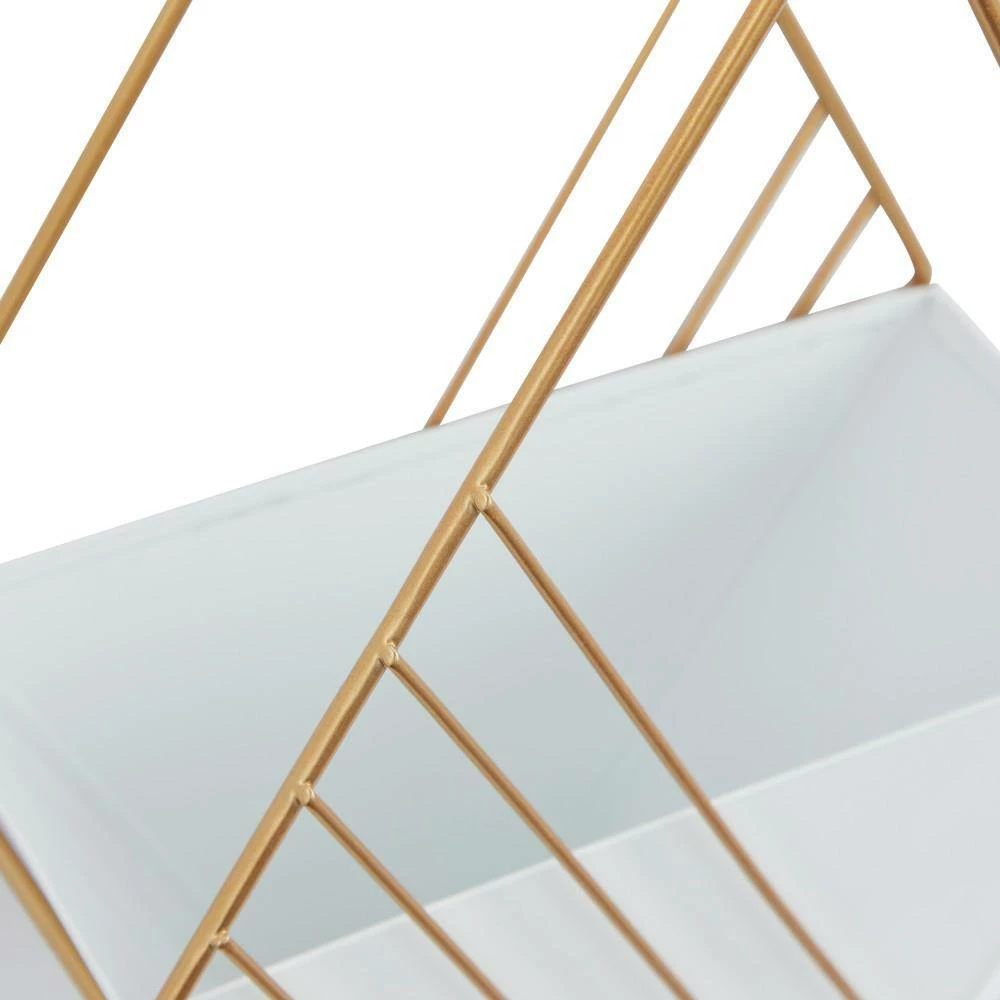 - White and brassy gold wall planter set features cone-shaped pots supported by gold open-designed diamond metal frames with line patterns