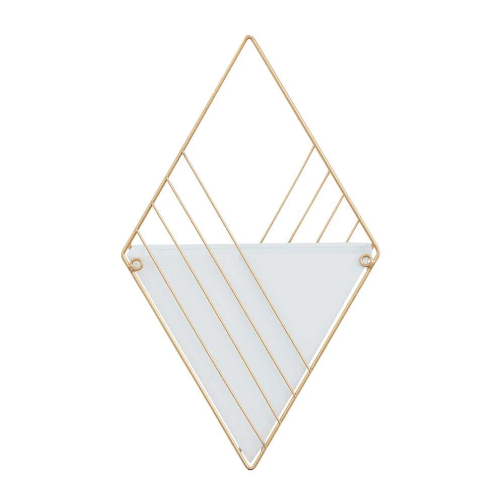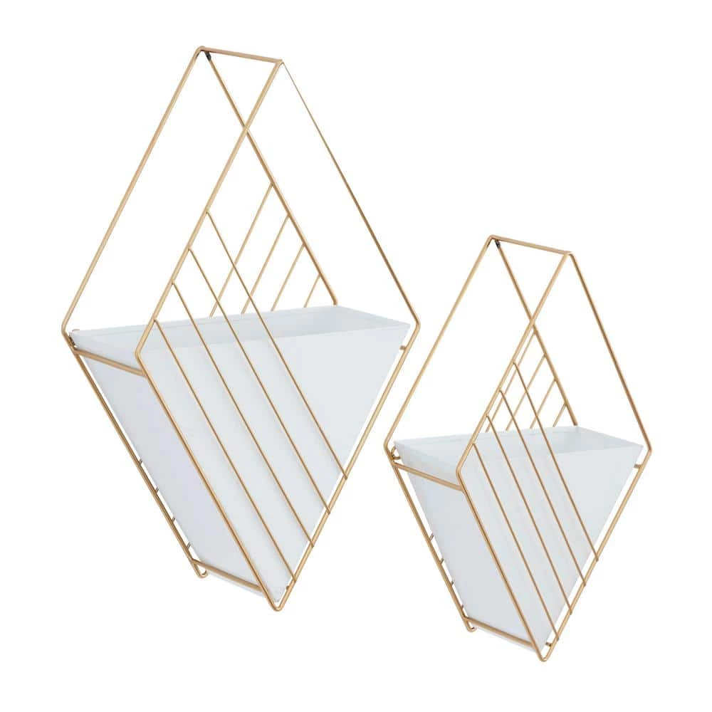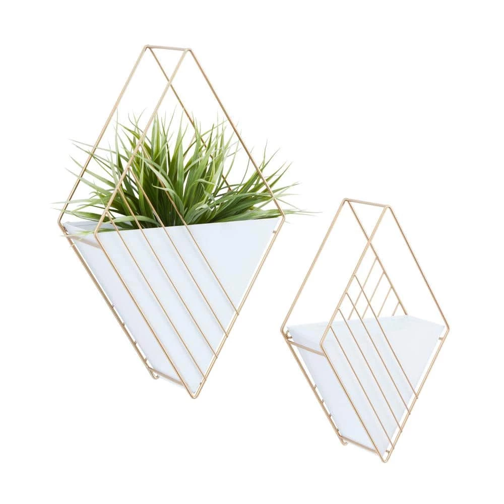 - A set of white and brassy gold metal wall planters with cone-shaped pots and diamond-shaped frames with line patterns