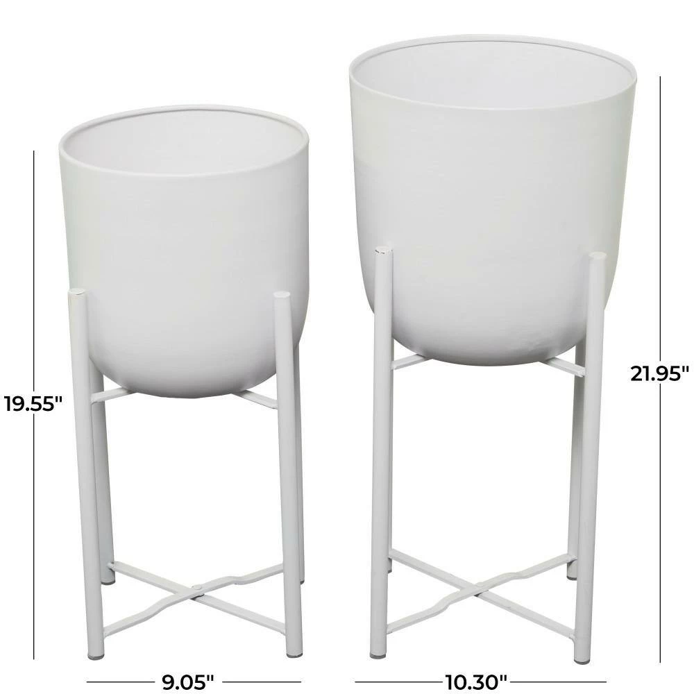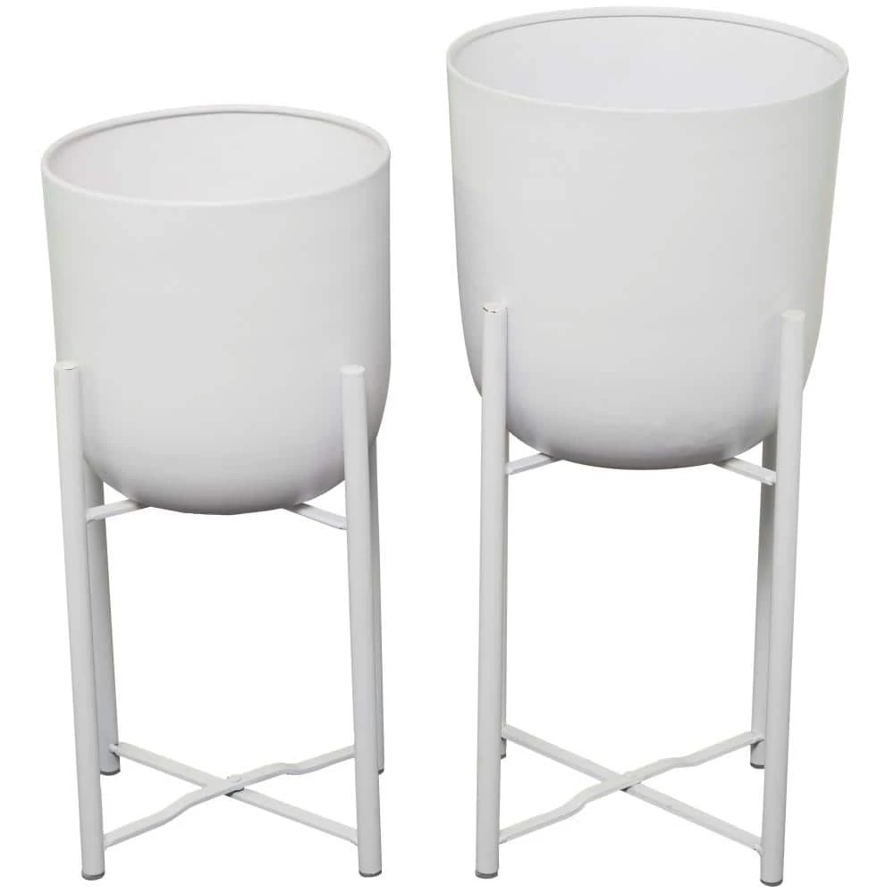 Create a dashing greenery area within your home or outdoor patio space as you show off your plants and flowers in these elevated metal floor planters. This item ships in 1 carton. A great versatile decor for indoor or outdoor display but are not rust or weather resistant. Made in India. Planters have no drainage holes but are not watertight. Round white metal planters come as a set of 2. Modern style.