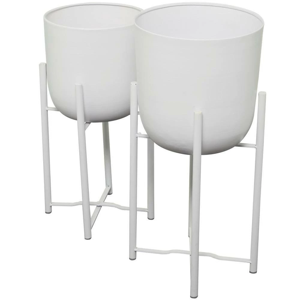 - Set of 2 white metal planters feature round pot shapes with a deep setting and a medium-height, x-shaped planter stand