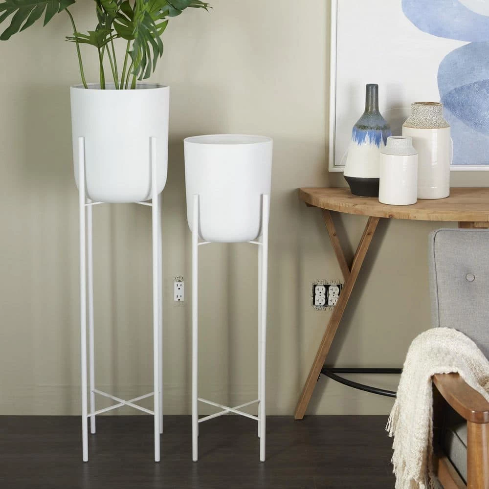 Create a charming greenery area within your home or outdoor patio space as you show off your plants and flowers in these elevated metal floor planters. Designed with white rubber stoppers at the base that prevents scratching of floors and surfaces. This item ships in 1 carton. A great versatile decor for indoor or outdoor display but are not rust or weather resistant. Made in India. Planters have no drainage holes but are not watertight. Round white metal planters come as a set of 2. Modern style.