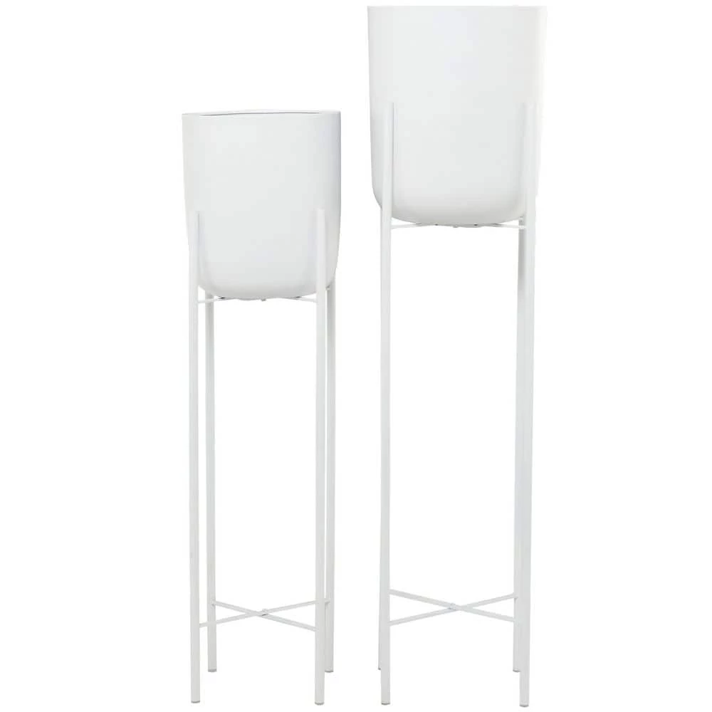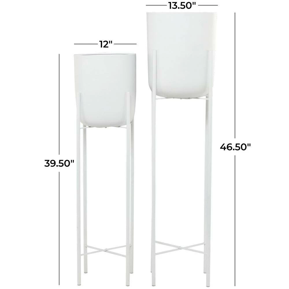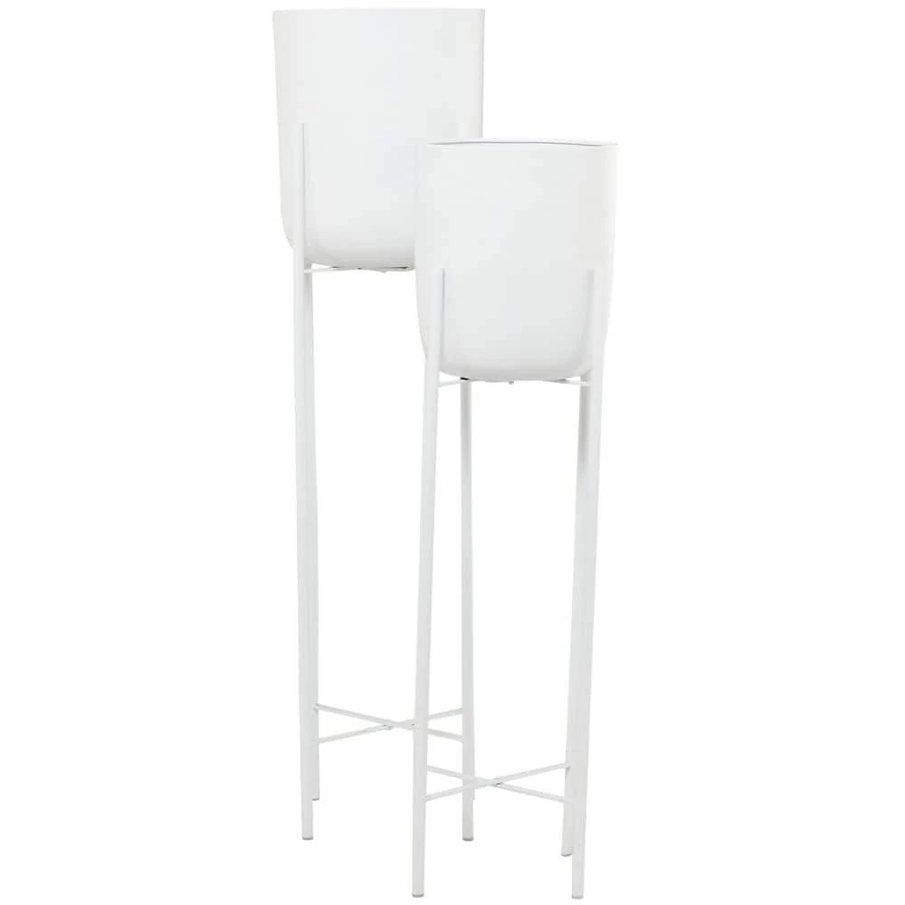 - Set of 2 white metal planters feature a round pot shape with a deep setting and tall x-shaped planter stands