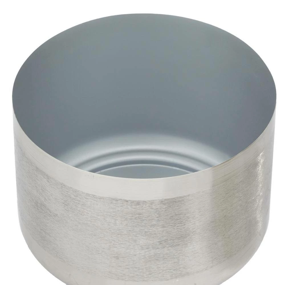 - A silver metal planter set featuring cylindrical structure with wide mouth openings and round bottoms