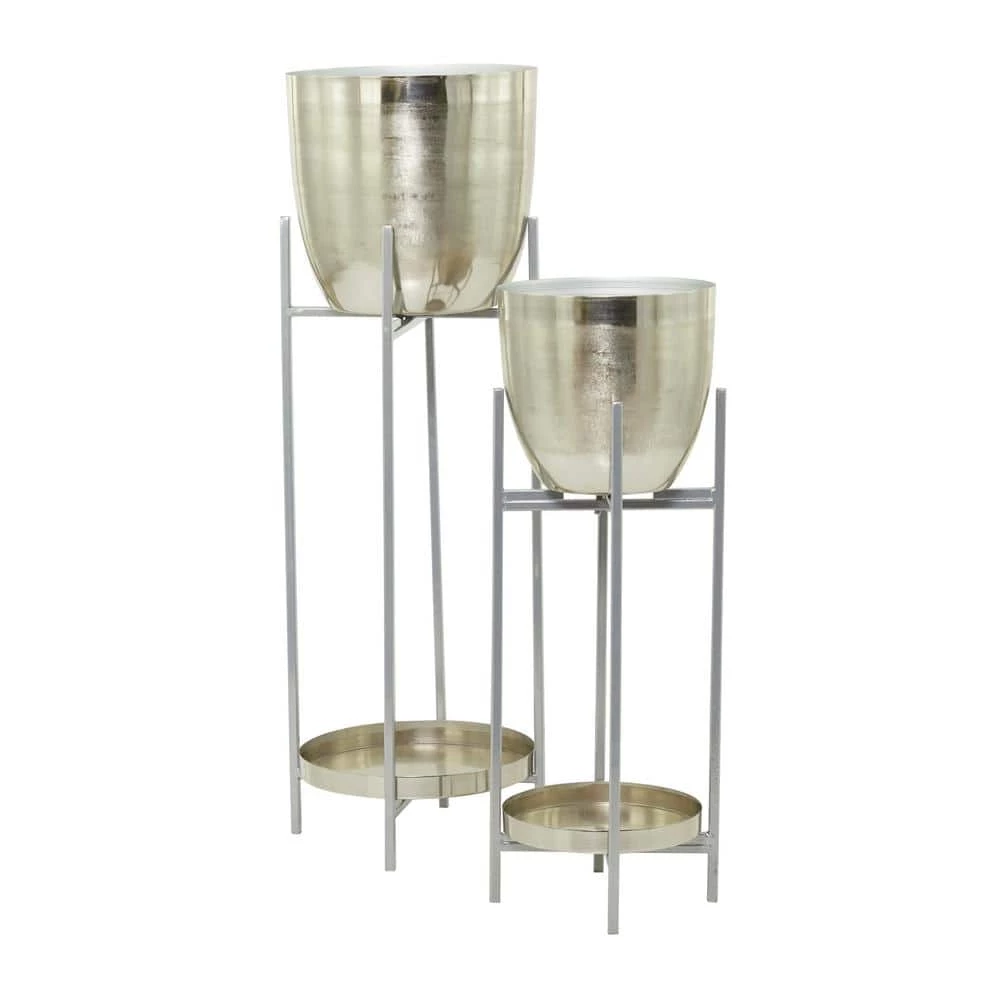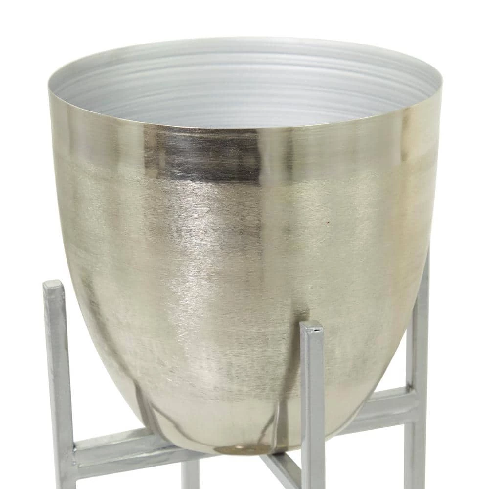 - Modern decorative planters featuring shiny silver round pots mounted on tall slender stands with x-shaped supports and round metal plates for extra storage