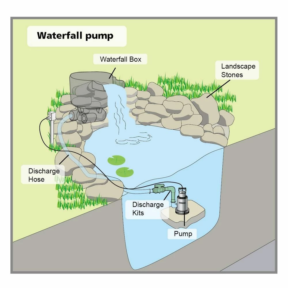 This heavy-duty corrosion resistant stainless steel submersible waterfall pump provides long life in rough environments. It can create streams, waterfalls or fountains in your garden pond. The water cooling and oil free motor design is safe to use around.