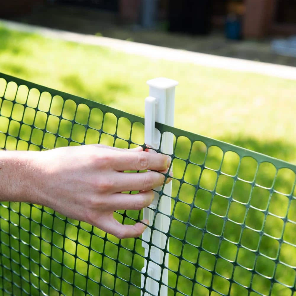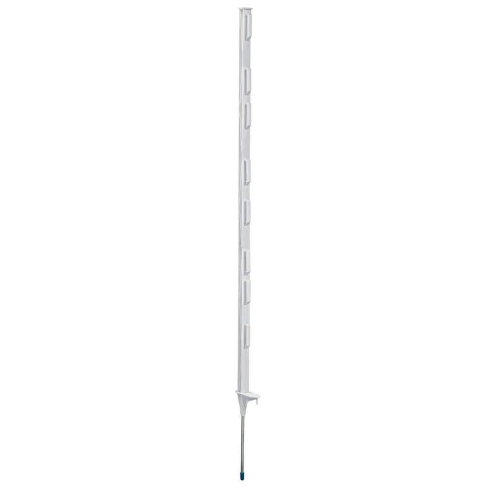 Everbilt Plastic Step-In Electric Fence Post is designed for quick installation of temporary electric fencing and other lightweight garden fences. The electric fence post is made from reinforced polypropylene plastic with heavy-duty steel spike. The plastic composition insulates electrical fence wire and polytope. The lightweight step-in fence post has 8 molded clips that are spaced 2 in. apart. The clip holds the electric fence wire or other garden fencing. The white color increases visibility. The post has a large flange with a spike on it that restricts rotational movement of the post. The post can easily be pushed into the ground by pressing your foot on the large step-in flange. These plastic posts for electric fencing can quickly be removed and reused. The total above ground H when the 6 in. heavy-duty steel spike in pressed into the ground is 40 in.