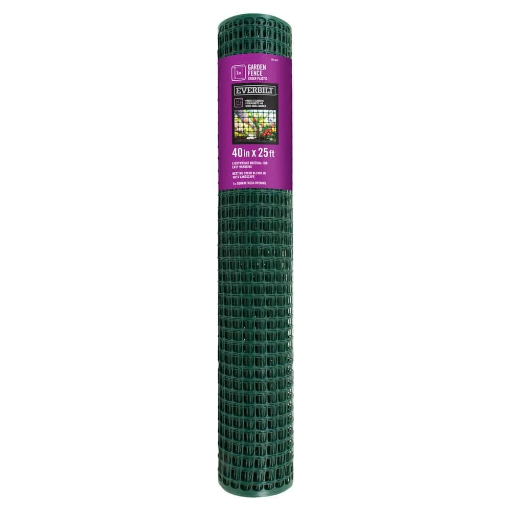 Everbilt 40 in. x 25 ft. Plastic Mesh Fencing has multiple uses around the garden and home. Use to protect gardens and plants, surround compost piles, or create pet play areas. The green polyethylene plastic is packed in a roll that is easy to lay out. The fence is flexible and easy to form around shapes, attach to posts, or simply place over the top of vulnerable plants. The fine mesh openings are 1 in. squares that are small enough to prevent most small animals from getting through or stuck in the garden fencing. The garden fence netting won’t rust and is UV resistant, making it an option that can be used for multiple seasons.