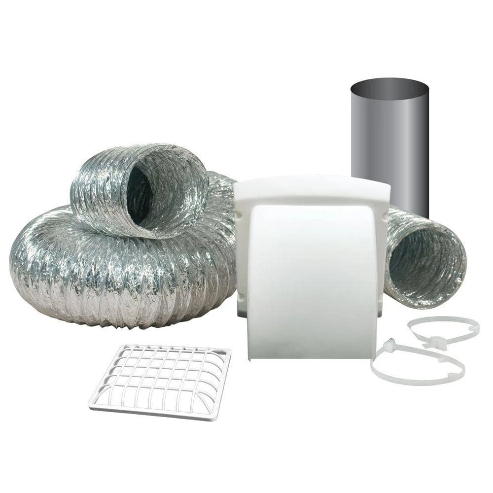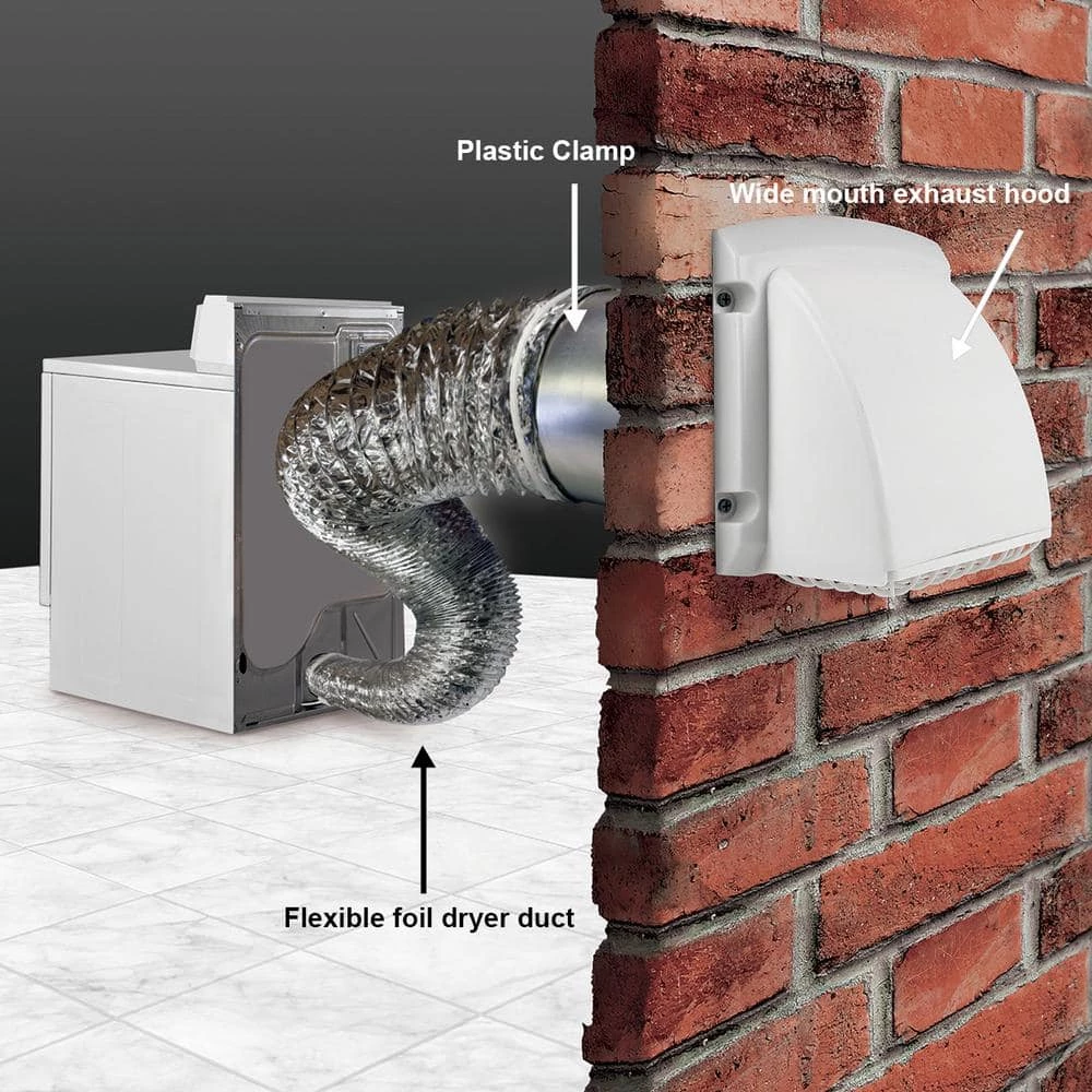 The Wide Mouth Dryer Vent Kit includes a 4 in. wide mouth exhaust hood, 4 in. x 8 ft. dryer transition duct and 2 plastic adjustable clamps. The exhaust hood features a robust, wide mouth cap for optimum airflow and snug fit back draft damper that prevents cold air, snow or rain from entering the home. Additional features of the hood include a removable pest screen that helps to keep pests out and allows for easy cleaning of the duct.