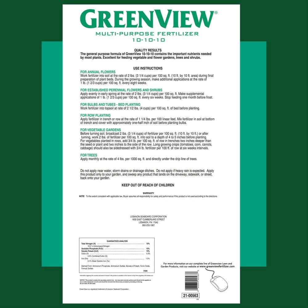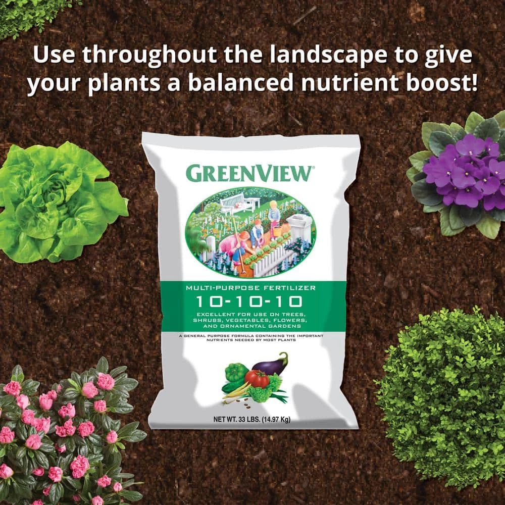 GreenView Multi-Purpose Fertilizer 10-10-10 is a general purpose fertilizer that contains important nutrients needed by most plants. with a balanced NPK formula of 10-10-10 it will be excellent for use on trees, shrubs, vegetables, flowers and ornamental gardens. Feed your plants the nutrients they need with this ready to use fertilizer.