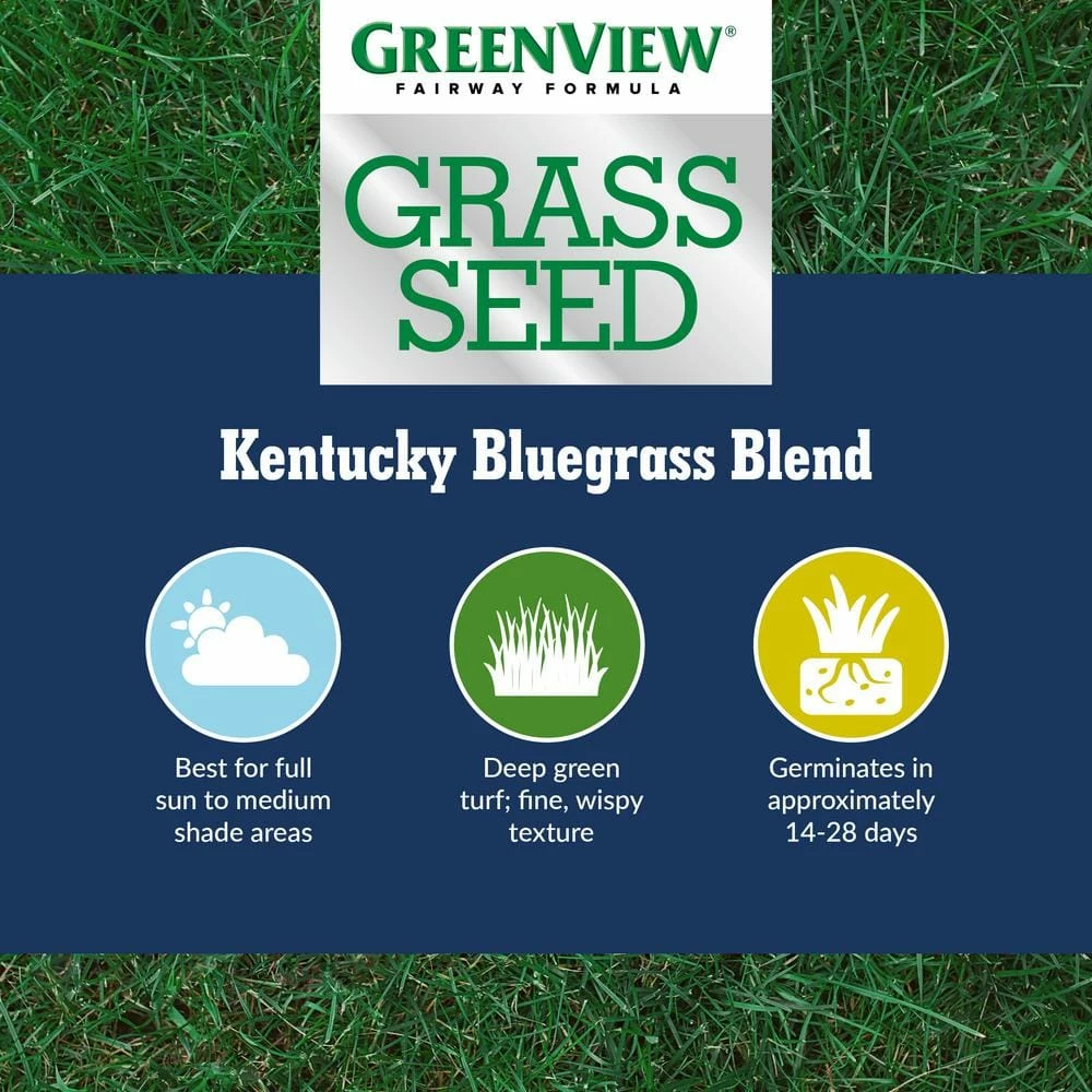 GreenView Fairway Formula Kentucky Bluegrass Blend combines only top-rated, cool season seed varieties. This blend will produce a beautiful dark green turf with the fine, wispy texture known to Kentucky bluegrass. The lawn density created by this mix is consistently excellent as it self-repairs in any areas that become worn from family foot traffic.