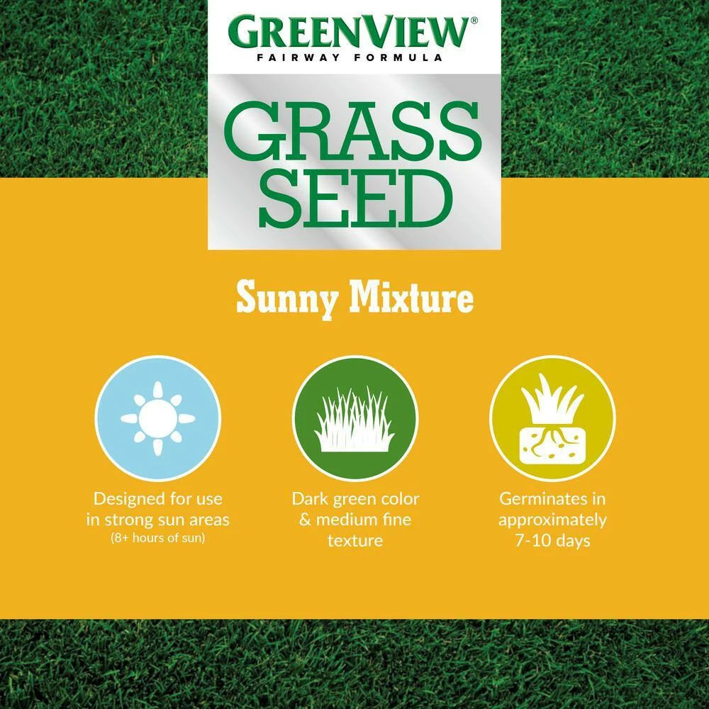 GreenView Fairway Formula Sunny Grass Seed Mixture is a top-quality cool season mixture of grass seed that will grow a thick, lush green lawn. This grass is meant to thrive in hot, sunny locations where few trees are present. This new generation seed will ensure that even on the busiest and hottest days during the summer, your lawn will remain strong, green and luxurious.