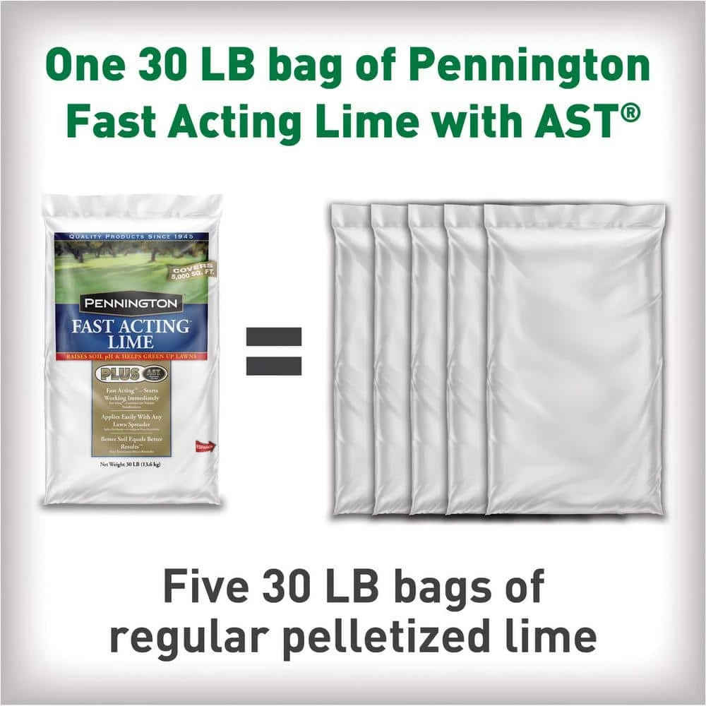 Pennington Fast Acting Lime Plus AST goes to work right away to raise your soil pH. Low pH can cause moss and bare spots in your lawn and can encourage weeds to grow. Limestone helps balance soil pH to create a better soil environment for your lawn, which significantly reduces these problems. Pennington 30 lb. Fast Acting Lime Plus AST is more concentrated than regular dolomitic limestone, so you have to use only 30 lbs. to cover 5000 sq. ft. This unique formula combines Advanced Soil Technology (AST) with high-quality lime to maximize the benefit to the soil.