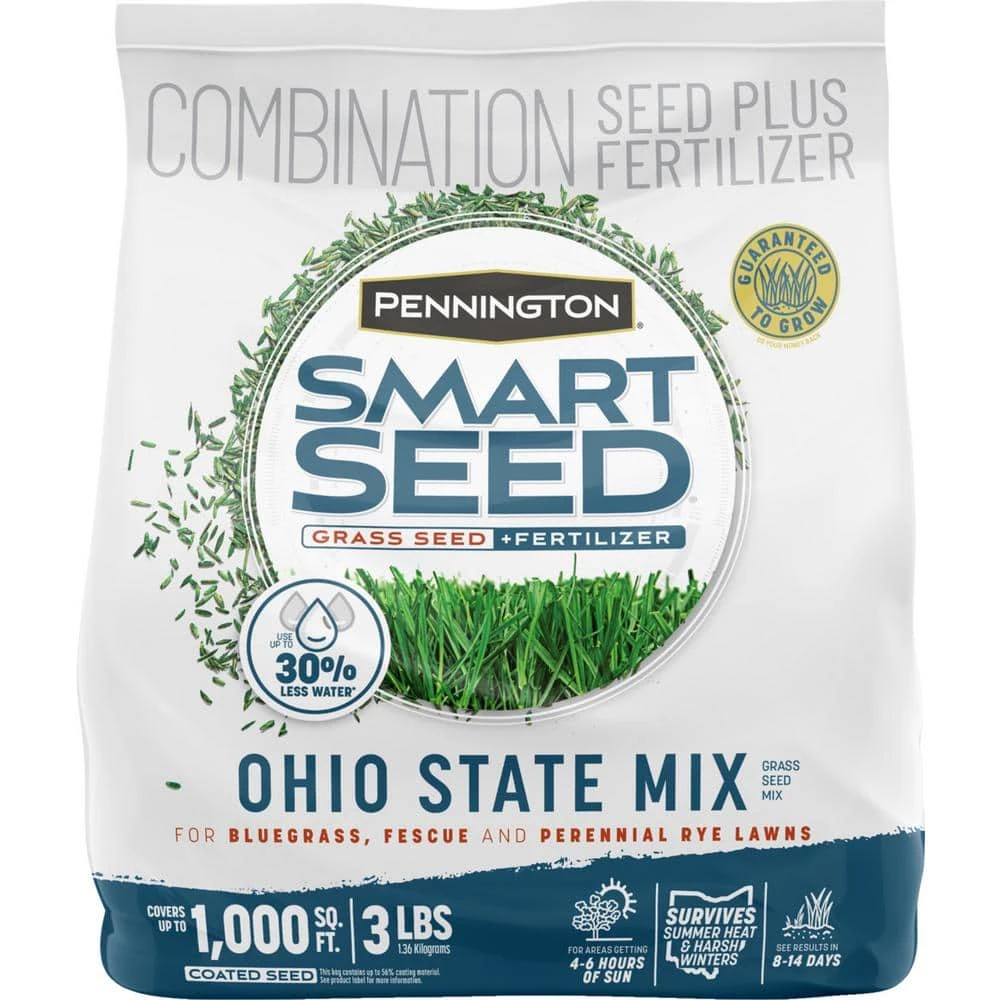 In Ohio, your lawn must withstand cold winters and hot, humid summers. Pennington Smart Seed Ohio Mix consists of a premium mix of Kentucky Bluegrass, Perennial Ryegrass and Fine Fescues that are specifically designed to flourish in this climate. Smart Seed Ohio grass seed mix is disease resistant and drought tolerant and contains just the right amount of fertilizer to help your lawn succeed. In areas of your lawn that receive 4-hours to 6-hours of sun daily, plant this grass seed mix in the early spring or early fall and see results in 8-days to 14-days. This 3 lbs. bag covers up to 1,000 sq. ft. for overseeding an existing lawn and 330 sq. ft. for starting a new lawn from scratch. What makes Smart Seed smart. It’s our industry-leading innovation. Pennington’s NexGen Turf Research is the largest private grass seed research facility. We lead the industry in developing top-performing, water-conserving, sustainable seed. Once established, our purebred, drought-tolerant Smart Seed grass requires up to 30% less water than ordinary grass seed. That’s year after year, for the life of your lawn. Plus, our advanced, Fertilizer-Enhanced Seed Coat technology speeds establishment and promotes greener grass. Born from Pennington innovation and NexGen breeding and research, Smart Seed brings you better seed, better sustainability and better results.