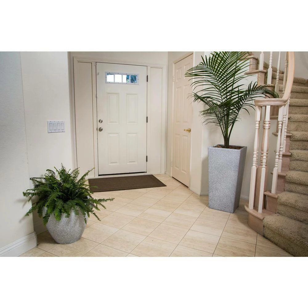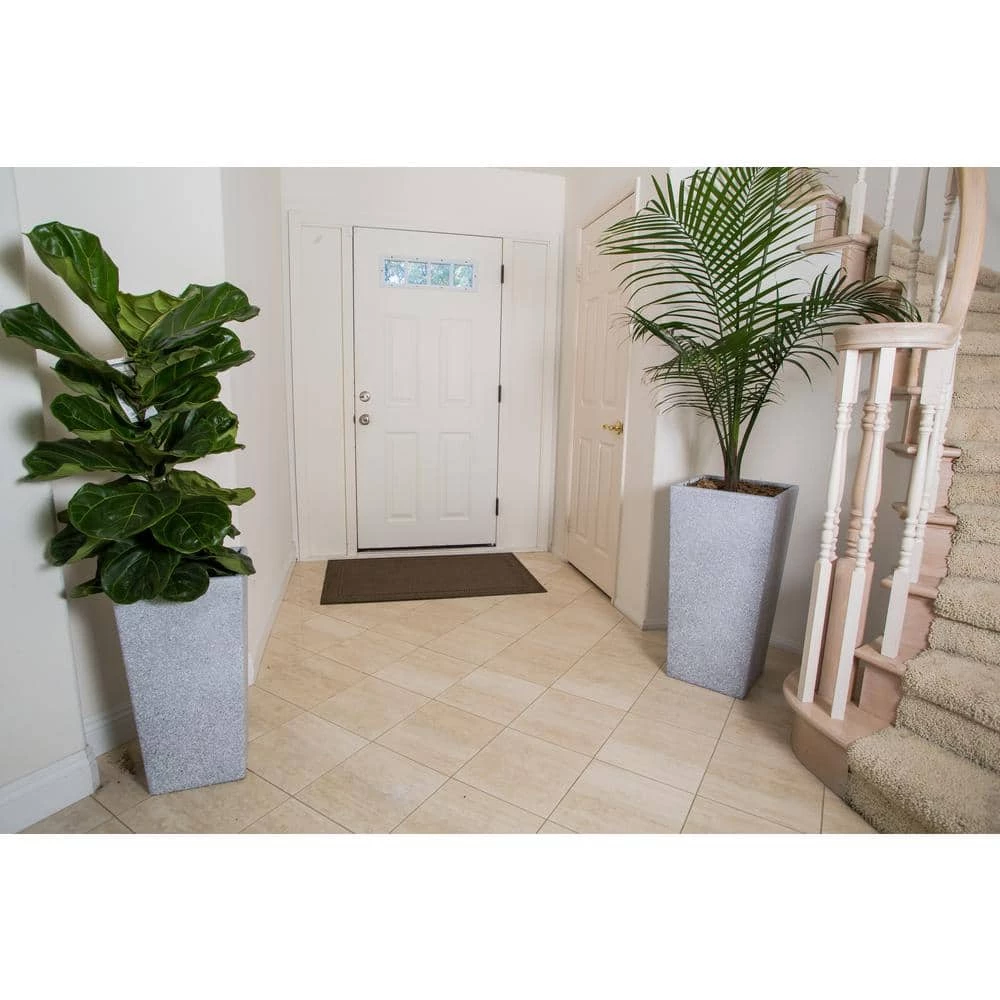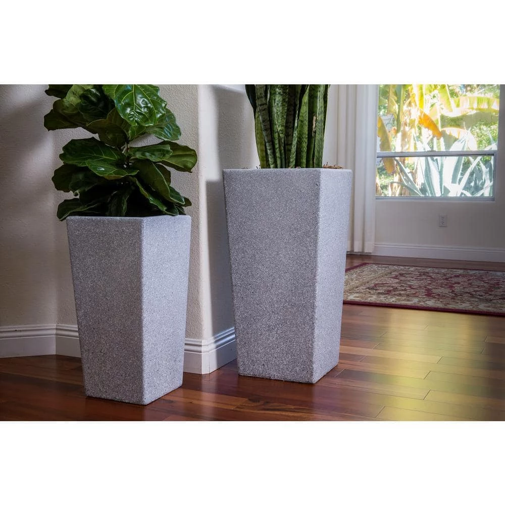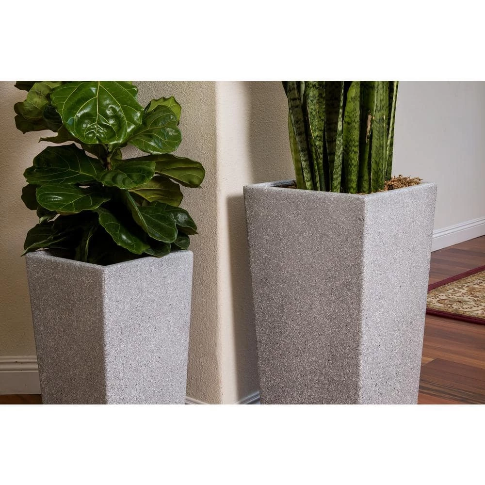 - Large planter measures 14.5 in. W x 14.5 in. L x 30 in. H with base diameter of 11.5 in., small planter measures 12 in. W x 12 in. L x 24 in. H with base diameter of 9 in. made of concrete and fiber stone