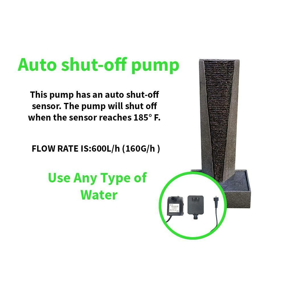 - Auto shut off pump: This beautiful water fountain features an auto shut off pump sensor which detects when the temperature reaches 185 °F and shuts off the pump automatically to protect it. The flow rate is 600L/h (160GPH)